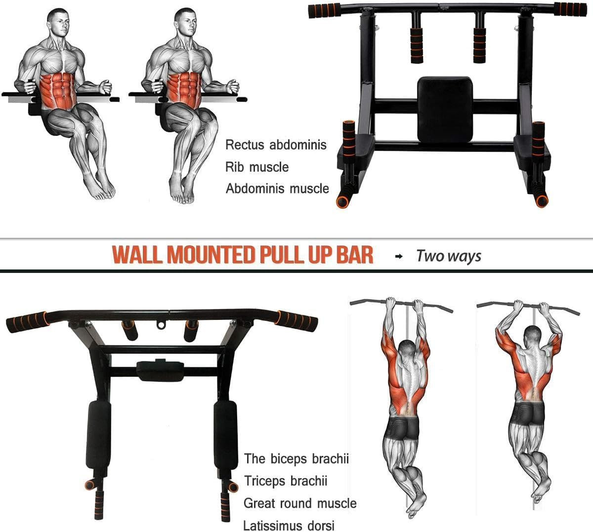 Wall Mounted Ergonomical Design -- The pull up station has a 2” high density back cushion support and arm rest, effectively reduce the pressure on spine and elbow, and provide comfort as you workout your abdomen, waist, chest, and upper body.